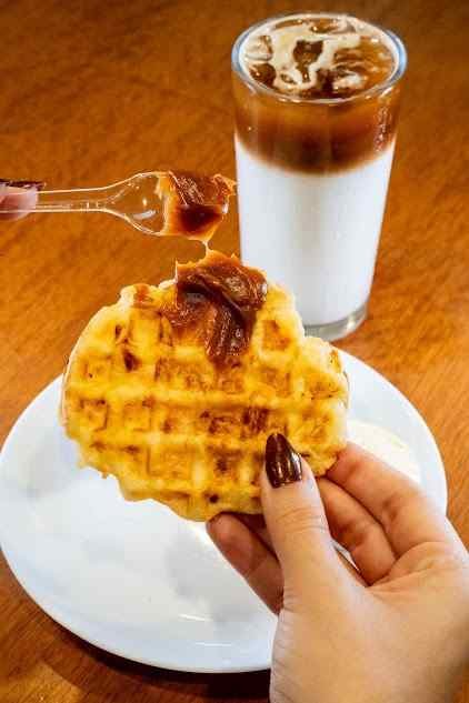 Opção 1: Waffler com recheio (doce de leite, requeijão ou requeijão com azeitona) + Café com leite gelado