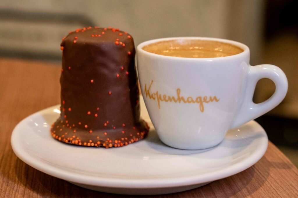 Opção 1: Cookie de canela com cobertura de chocolate + Café com leite (50ml)