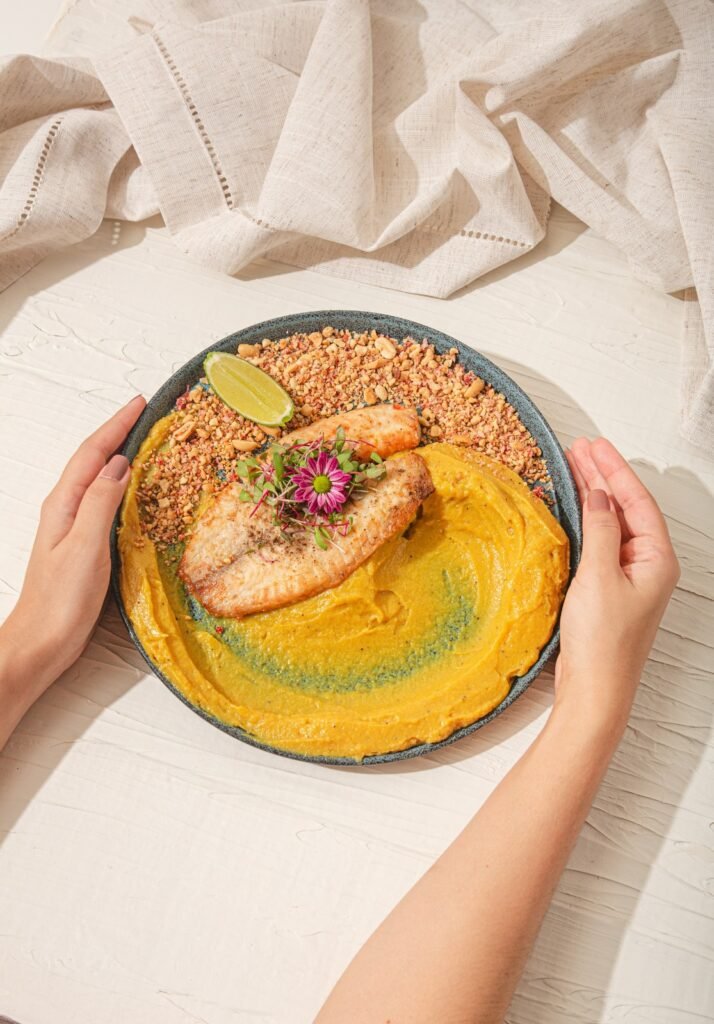 O preferido: filé de tilápia grelhado, purê de banana da terra e farofa panko, nuts e beterraba