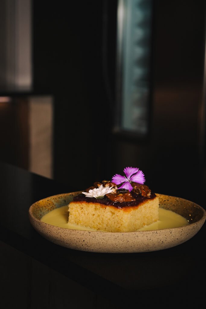 A sobremesa fica por conta do Bolo de Azeite, que chega à mesa mergulhado no creme inglês, acompanhado de geleia da fruta da estação e nutz caramelizadas.