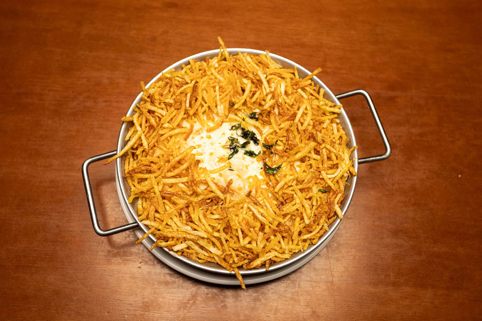 Opção 2: Camarão Olinda – Camarões servidos sobre cremoso arroz com ervilhas e presunto, envolvido com molho branco. Gratinado com queijos muçarela e parmesão. Acompanha batata palha