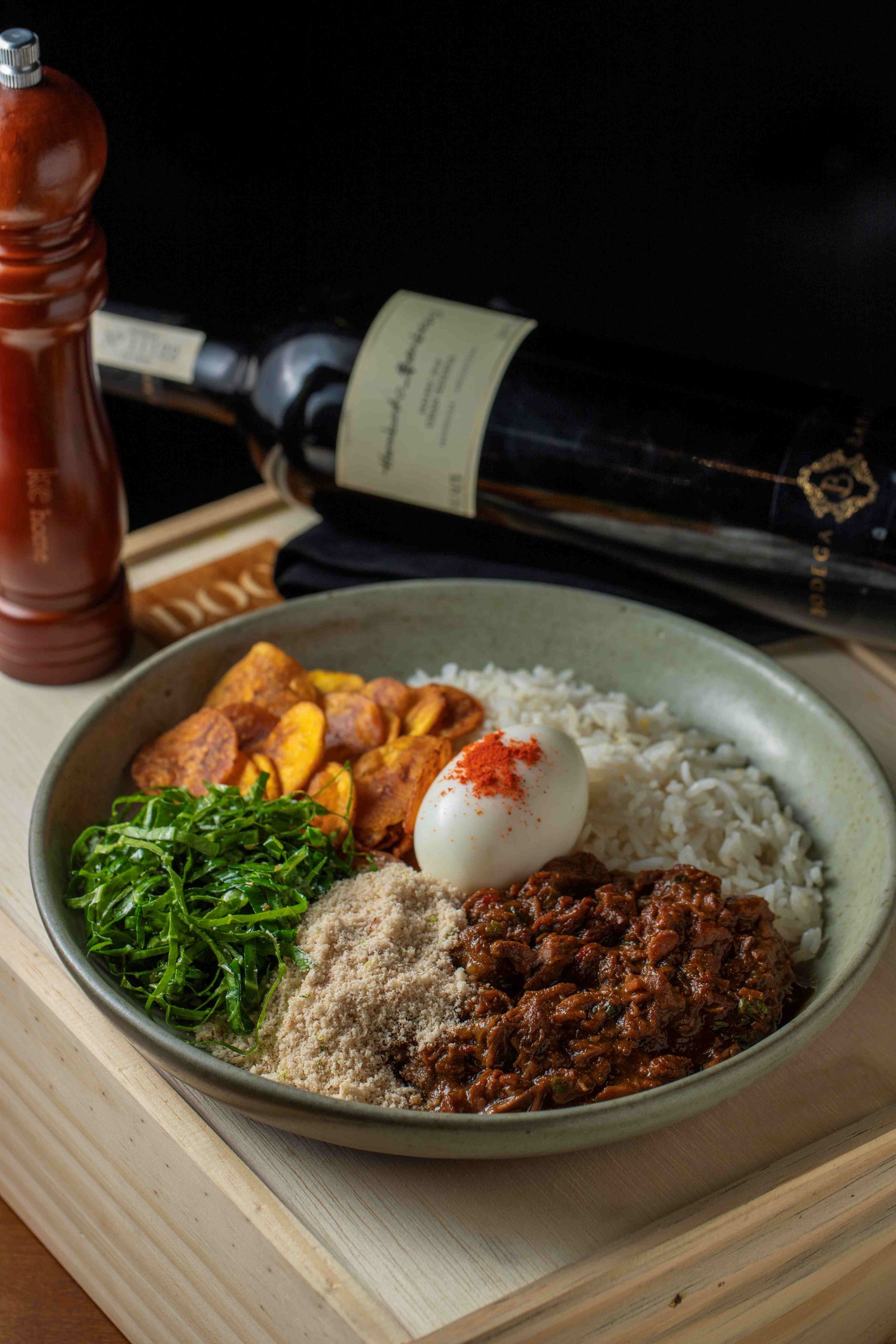 Opção 1: Picadinho D.O.C – Picadinho de carne, arroz branco, couve refogada, farofa cítrica e banana chips com ovo molet