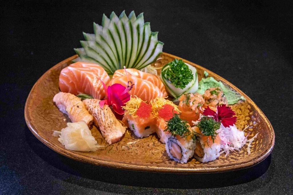 Prato Principal: Combinado 12 peças (4 sashimi de salmão, 2 de salmão, 2 niguiri de salmão, 2 uramaki de salmão e 2 batera de salmão)