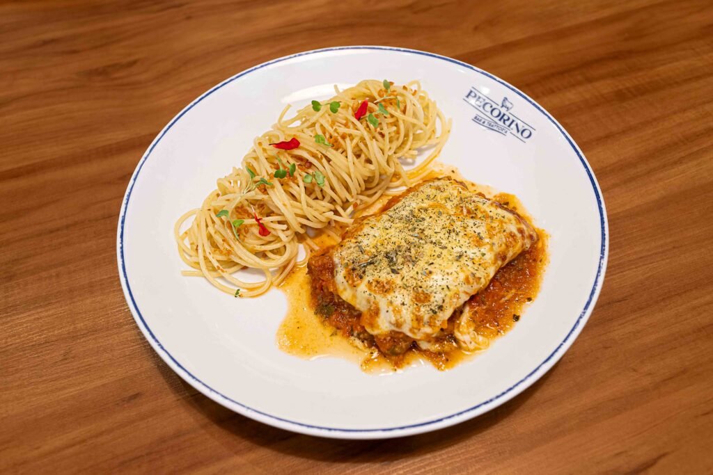 Filet de pescada alla parmigiana com spaghetti ao alho e óleo do Pecorino